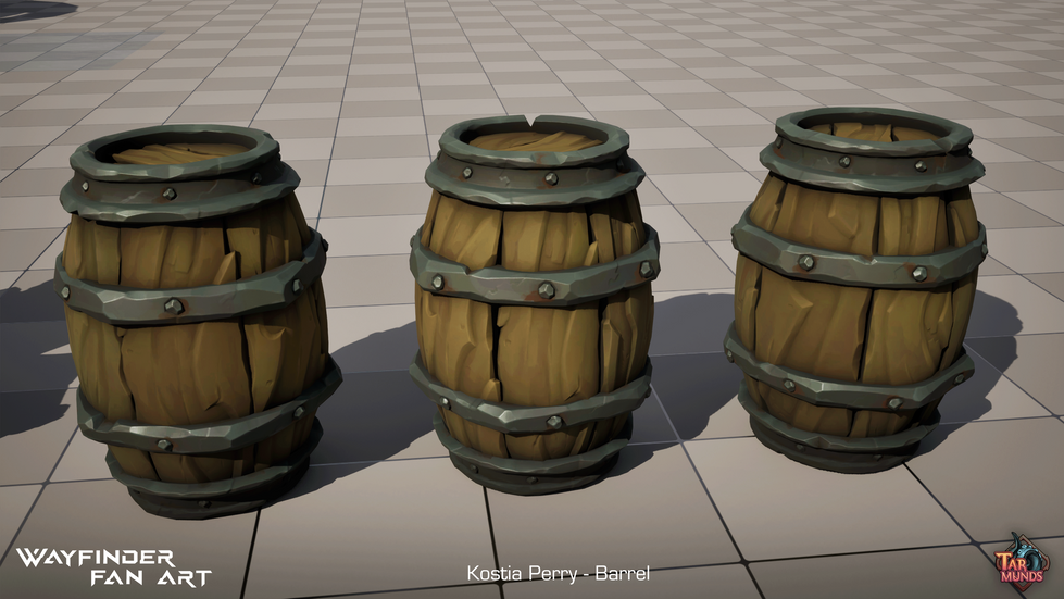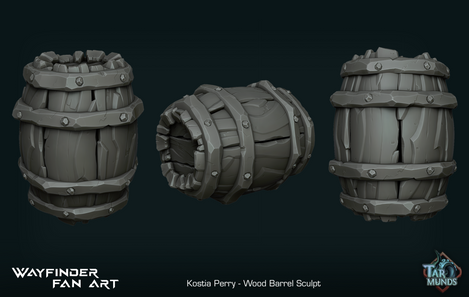 On this version of the barrel, I quickly created a first albedo pass using the Normal OBJ, Curvature and Ambient Occlusion baked maps in Photoshop. I also added a little noise over the albedo using the overlay blending mode to get a slight color variation in the base.